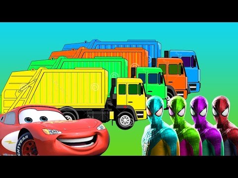 Spiderman is riding on coloured trucks with Lighting Mcqueen, and then dances with the other colored spidermans. Fun cartoon for kids. Sudscribes to the chanel